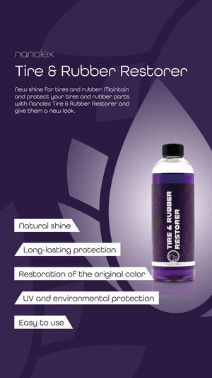 Nanolex Tire & Rubber Restorer מספק טיפול ייחודי לצמיגים וגומי ברכב המחדש את המראה המקורי והעמוק של הצבע, יוצר הגנה מפני קרני UV ויובש, ומשאיר גימור טבעי – לא דביק ועמיד לאורך זמן. נוסחה מתקדמת שחודרת עמוק אל תוך הצמיג, מחזירה את הגוון המקורי ומשמרת את גמישות פני השטח.